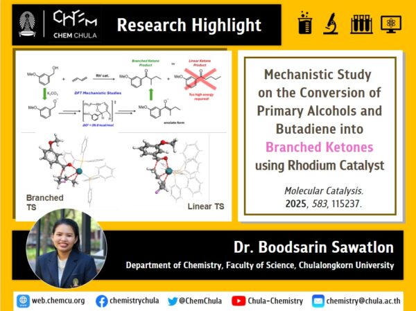 Mechanistic study on the conversion of primary alcohols and butadiene into branched ketones using a rhodium catalyst - This work investigates the mechanism of a Rh(I)-catalyzed transformation of primary alcohols and butadiene into saturated branched ketones, without premetalated intermediates or external hydrogen sources. DFT calculations reveal a four-step pathway involving alcohol oxidation, butadiene hydrogenation, carbonyl addition, and intramolecular hydrogen transfer. The rate-determining step is the sterically hindered carbonyl… …