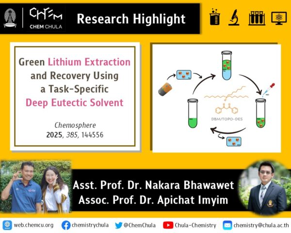 Faculty Members and Students Received Awards from Chula - Department of Chemistry congratulates our faculty members and students who received the awards from Chulalongkorn University in the year 2025.1. Assoc. Prof. Dr. Prompong Pienpinijtham - Student Affairs Award, Outstanding2. Assoc. Prof. Dr. Thanit Praneenararat - Teaching Award, Very Good3. Assist. Prof. Dr. Pumidech Puthongkham - Young Investigator Award in… …Faculty Members and Students Received Awards from Chula Read More »