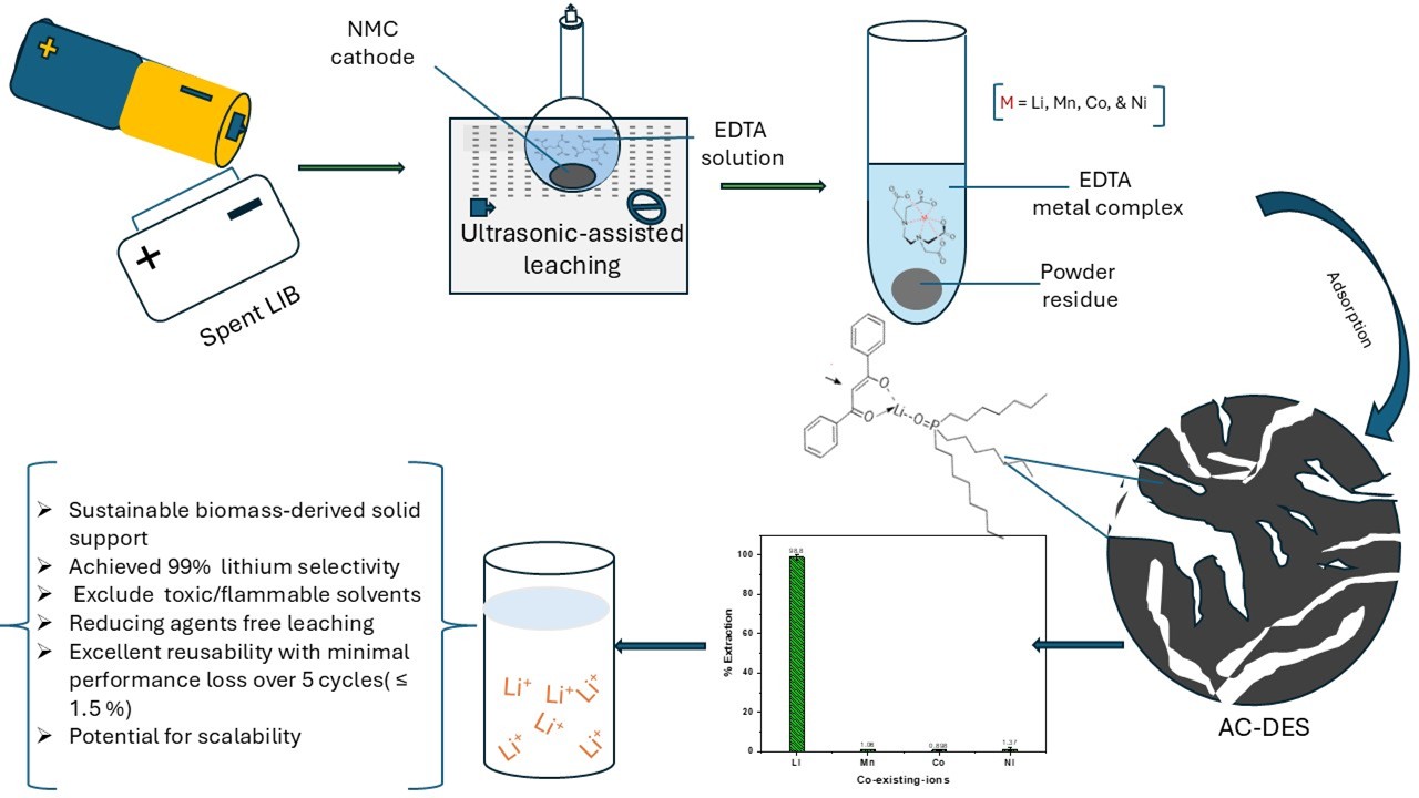 This research focuses on the green separation and recovery of lithium ions using Deep Eutectic Solvents (DES) as sustainable alternatives to conventional organic solvents. The work aims to design environmentally friendly solvent systems and functional materials that enable efficient, selective, and low-waste extraction processes.