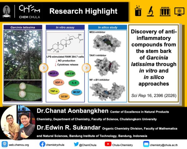 การค้นพบสารต้านการอักเสบจากเปลือกต้นมังคุดป่าอินโดนีเซีย - อาจารย์ ดร.ชณัท อ้นบางเขน ร่วมมือในการวิจัยกับ Dr. Edwin R. Sukandar จาก Bandung Institute of Technology, Indonesia และนักวิจัยอีกหลายท่าน จากหลากหลายสถาบันและสาขาความเชี่ยวชาญ ได้ค้นพบสารสำคัญที่มีฤท… …การค้นพบสารต้านการอักเสบจากเปลือกต้นมังคุดป่าอินโดนีเซีย Read More »