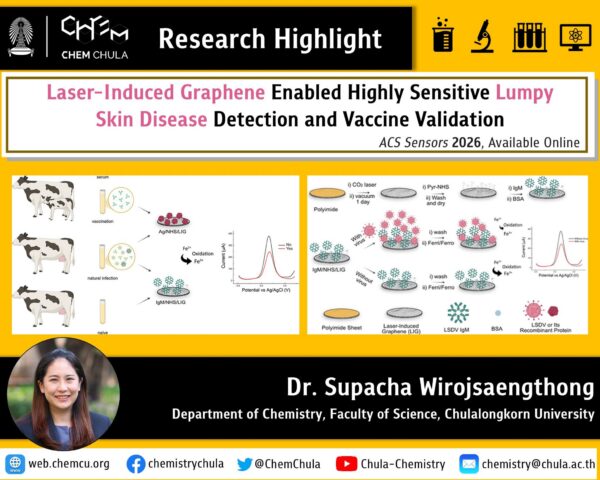 ตัวรับรู้ขั้วไฟฟ้ากราฟีนจากการเขียนเลเซอร์สำหรับทั้งการตรวจโรคลัมปีสกินและการประเมินประสิทธิภาพวัคซีนในวัว - กลุ่มวิจัยของ อ. ดร.ศุภชา วิโรจน์แสงทอง และ ผศ. ดร.ภูมิเดช พู่ทองคำ ร่วมมือในการวิจัยกับศ. ดร.วันชัย อัศวลาภสกุล ภาควิชาจุลชีววิทยา และนักวิจัยอีกหลายท่าน พัฒนาตัวรับรู้ขั้วไฟฟ้ากราฟีนจากการเขียนเลเซอ… …