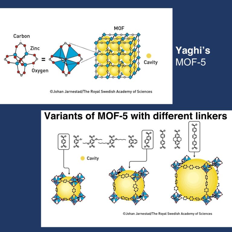 ปี 1995 ยากีใช้คำว่า “Metal–Organic Framework” เป็นครั้งแรก และในปี 1999 เขาก็สร้างผลึก MOF-5 จาก สังกะสี (Zn²⁺) และตัวเชื่อมเทเรฟทาเลต (terephthalate linker) ที่มีความแข็งแรง ทนความร้อนได้ถึง 300 องศาเซลเซียส และมีพื้นที่ผิวภายในเพียงไม่กี่กรัมเท่ากับ “สนามฟุตบอล” — นั่นคือครั้งแรกที่นักเคมีเห็นว่า พื้นที่ว่างในระดับนาโนมีค่ามหาศาลได้มากขนาดนี้ ต่อมายากีและทีมสามารถดัดแปลงโครงสร้างให้เหมาะกับการใช้งานหลากหลาย เช่น กักเก็บแก๊สไฮโดรเจน ดักจับแก๊สคาร์บอนไดออกไซด์ หรือแม้แต่สกัดน้ำจากอากาศในทะเลทรายในรัฐแอริโซนา ซึ่งนับเป็นผลงานที่เปลี่ยน “ความแห้งแล้ง” ให้กลายเป็น “หยดน้ำแห่งความหวัง” ด้วยพลังของเคมีโดยแท้จริง
